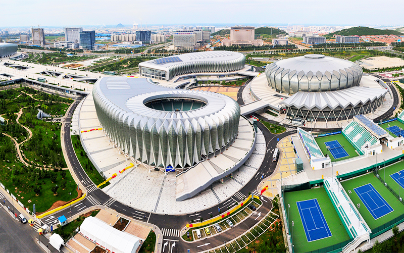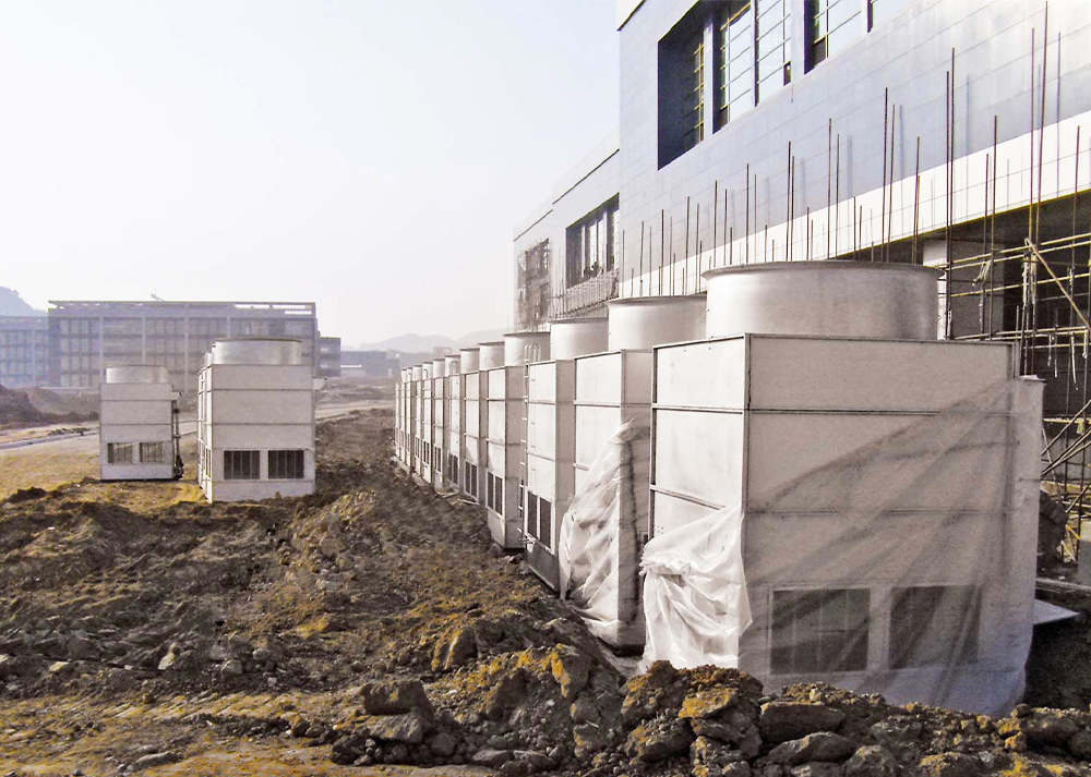 十一届全运会场馆建设所采用的闭式冷却塔,全部采用我公司N型闭式冷却塔,总共使用26台组,冷却水量约3150t/h,图片为运动会前夕设备刚进场待系统安装的施工现场。